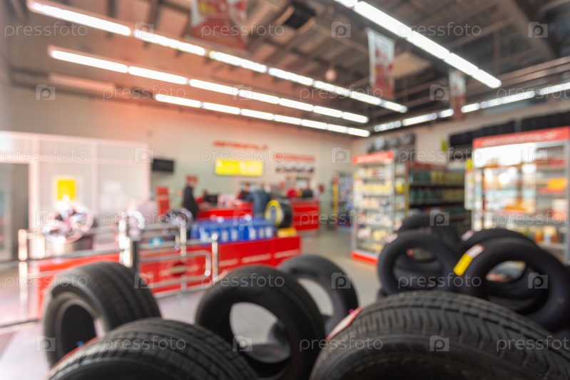 Размытые изображения рядов новых шин, выставленных на продажу в розничном магазине