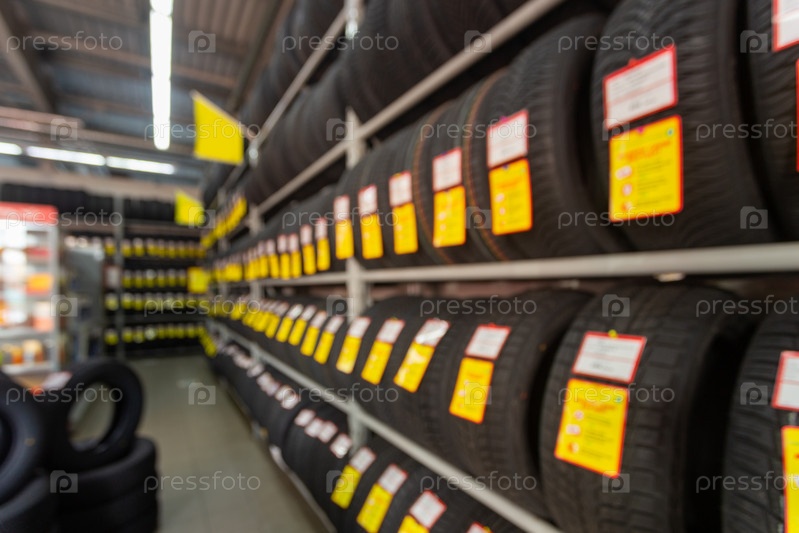 Размытые изображения рядов новых шин, выставленных на продажу в розничном магазине. Расфокусированный фоновый интерьер магазина по торговле автомобилями и шинами. Концепция транспортных услуг. Винтажный тон