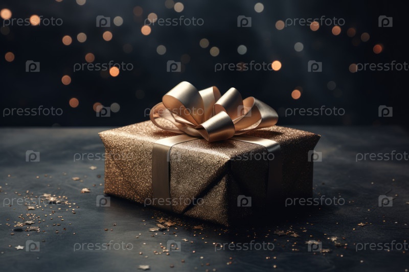 Подарок, золотистая короба, темный фон, премиальный вид