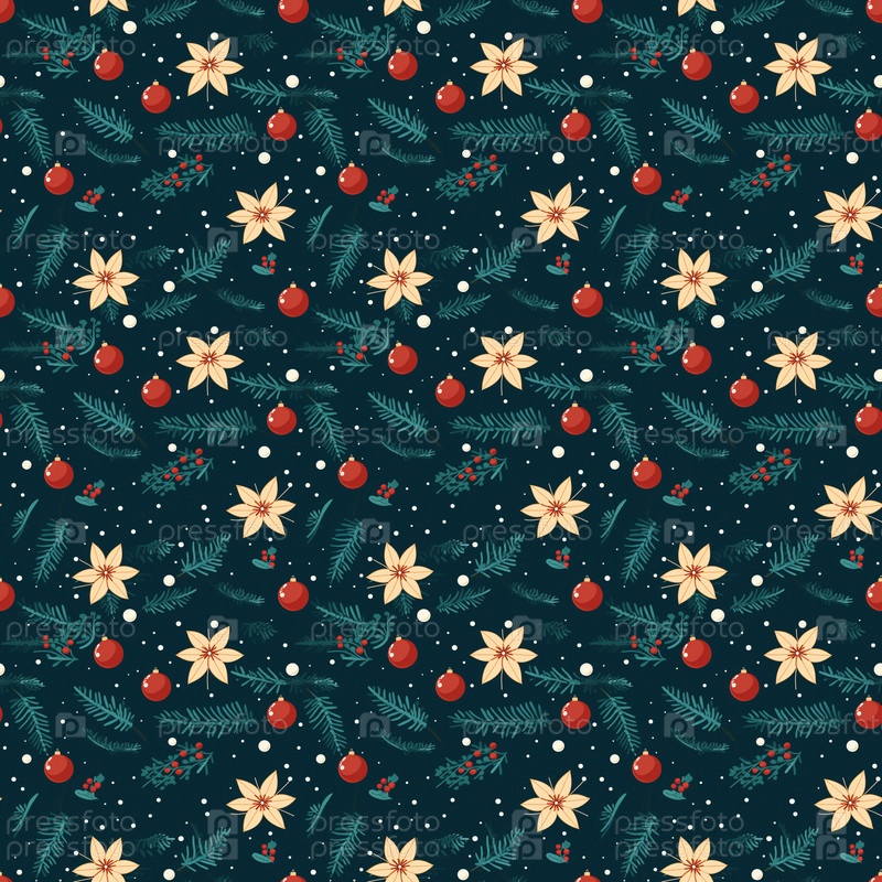 Новогодняя бесшовная текстура с еловыми ветками, елочной игрушкой и белым цветком