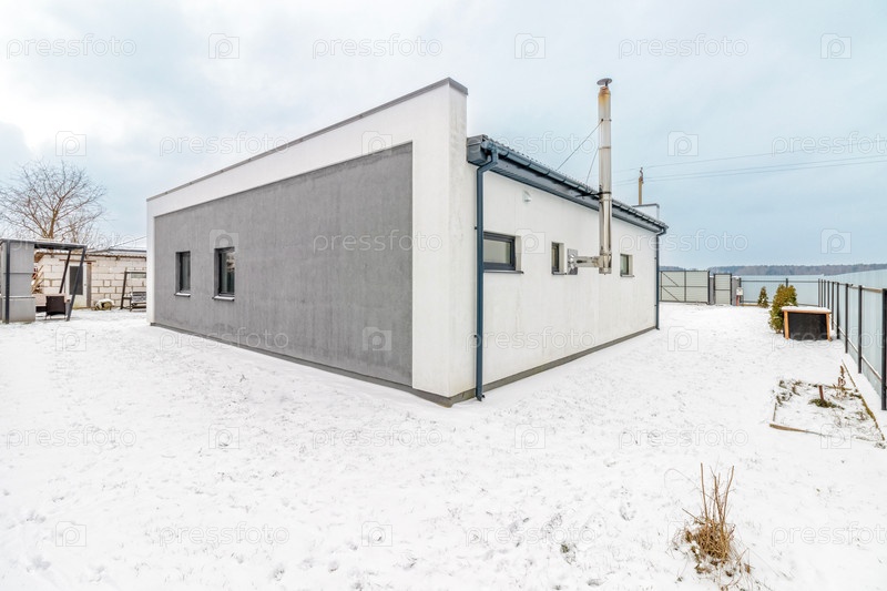 Современный одноэтажный дом с плоской крышей зимой, участок покрыт снегом