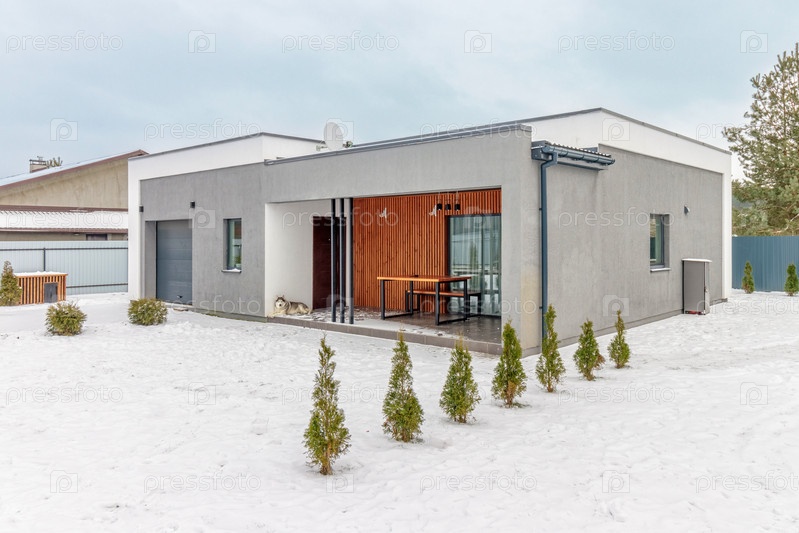 Современный одноэтажный дом с плоской крышей зимой, участок покрыт снегом