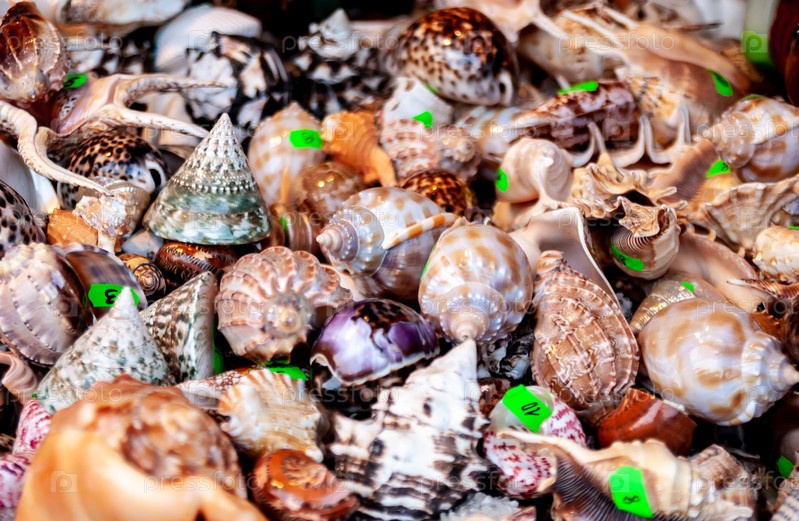 На прилавке продавца лежат ракушки разных цветов и форм, наклеены зеленые ценники