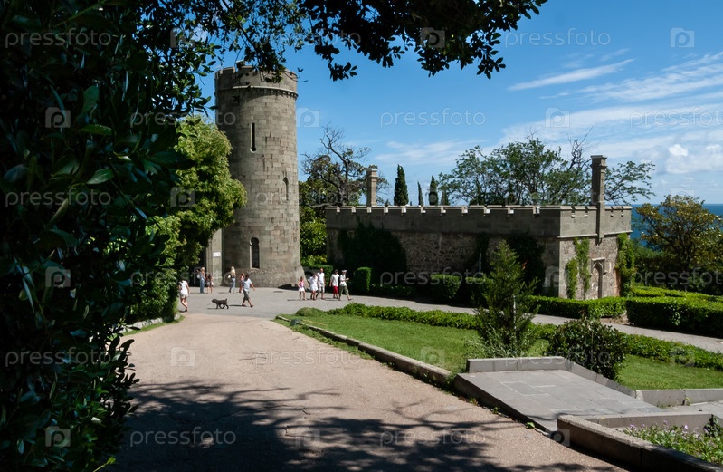 Воронцовский дворец 1848 г. Сторожевые башни из серых диабазовых блоков. Туристы гуляют. Алупка, Крым