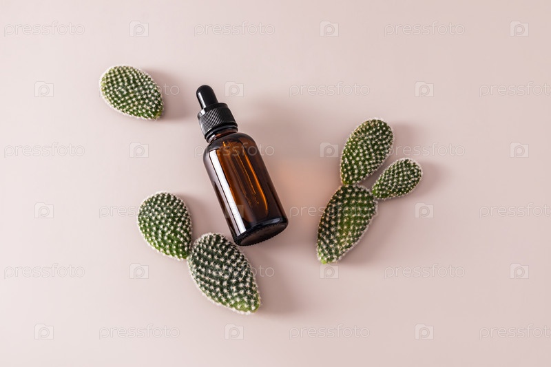 Увлажняющий косметический продукт в стеклянном флаконе с капельницей среди толстых листьев кактуса опунция. Естественное увлажнение, омоложение кожи