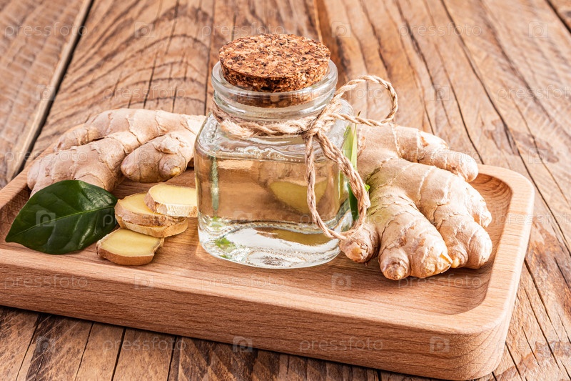 Домашнее натуральное масло из корня имбиря в стеклянной банке с пробковой крышкой на деревянном подносе с корнем имбиря и ломтиками на деревянном столе