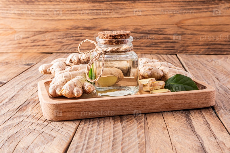 Стеклянная банка с пробковой крышкой с натуральным органическим маслом корня имбиря на деревянном подносе с корнями имбиря. Домашний уход за кожей, концепция ухода за волосами