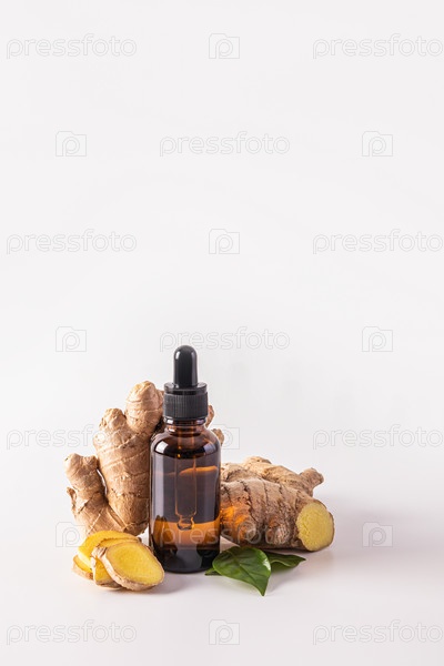 Косметическая бутылочка с капельницей с натуральным имбирным маслом, сывороточным экстрактом корня имбиря на белом фоне с корнем растения. Вертикальный вид