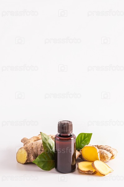 Медицинская бутылка с органическим маслом корня имбиря для ухода за кожей, волосами, спа-процедур. Естественный уход. Белый вертикальный фон. Место для копирования