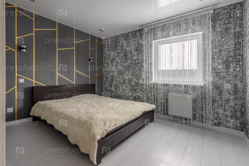 Современная спальня с серыми стенами и большой кроватью