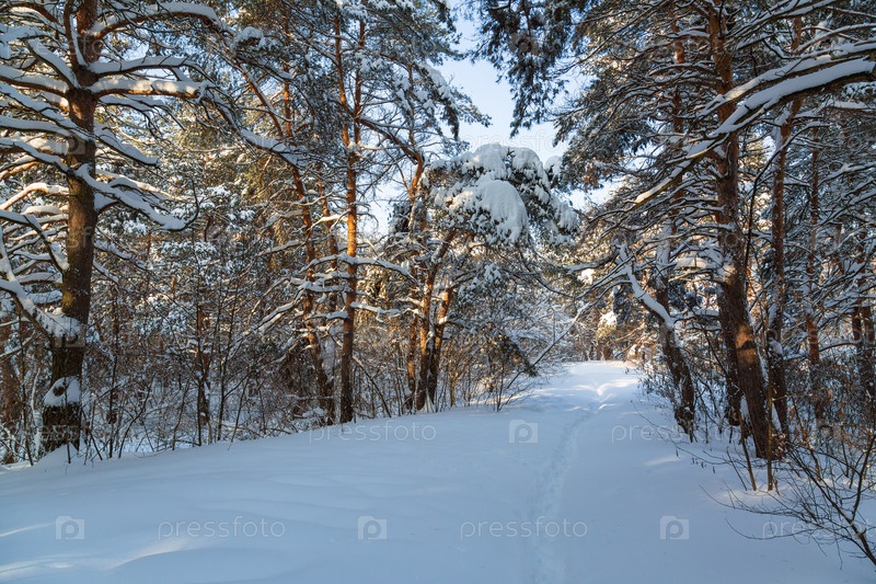 Солнечный зимний пейзаж с соснами