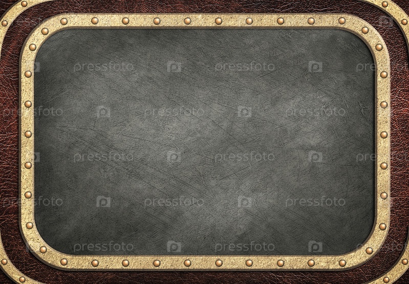 Металлическая табличка в стиле стимпанк в латунной рамке с заклепками на кожаном фоне