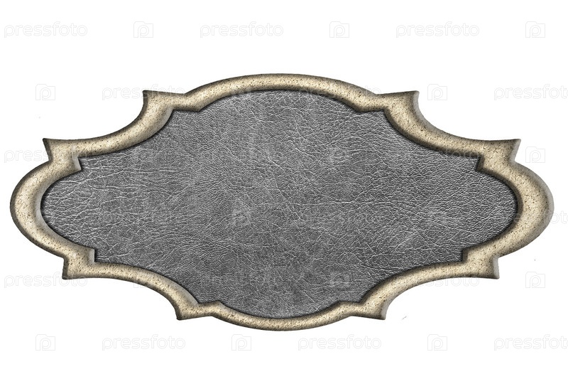 Старинный кожаный знак в фигурной металлической раме, изолированный на белом фоне