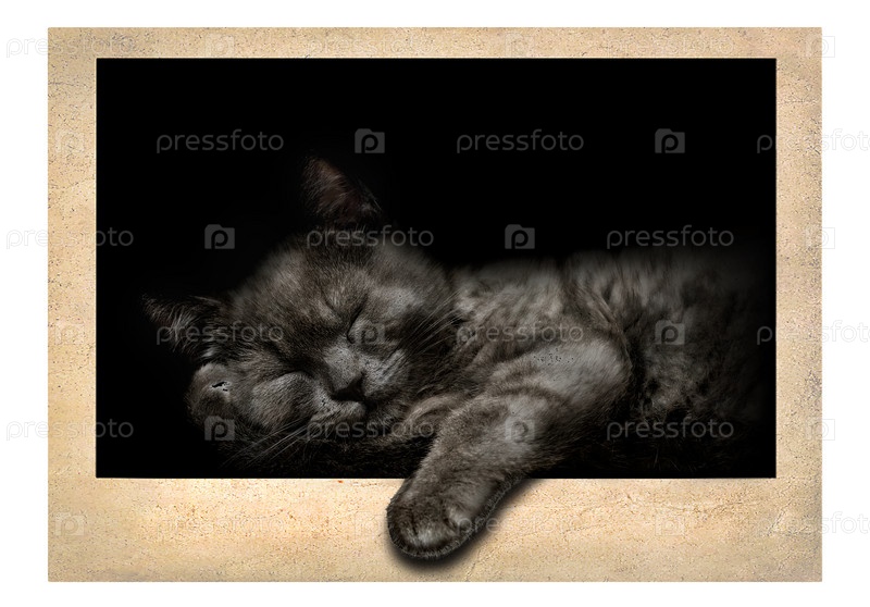 Спящий серый кот на старой винтажной фотографии на белом фоне