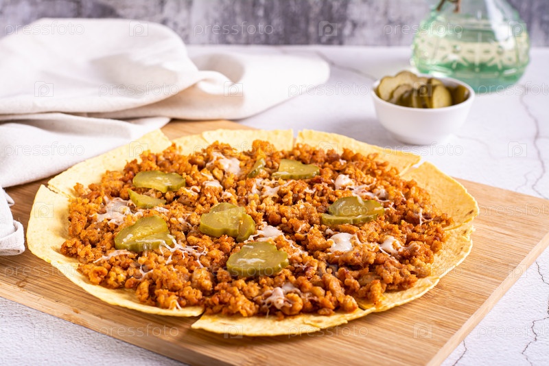 Разбейте тако с гамбургером на тортилье с маринованным огурцом и сыром на борту