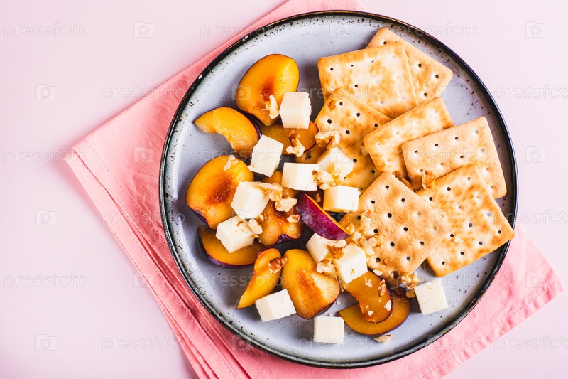 Крупным планом ужин для девочек, сыр, печенье, сливы на тарелке на розовом фоне, вид сверху