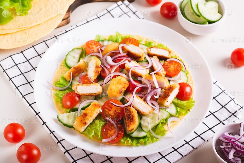 Тортилья с наггетсами, овощами и салатом на тарелке на столе