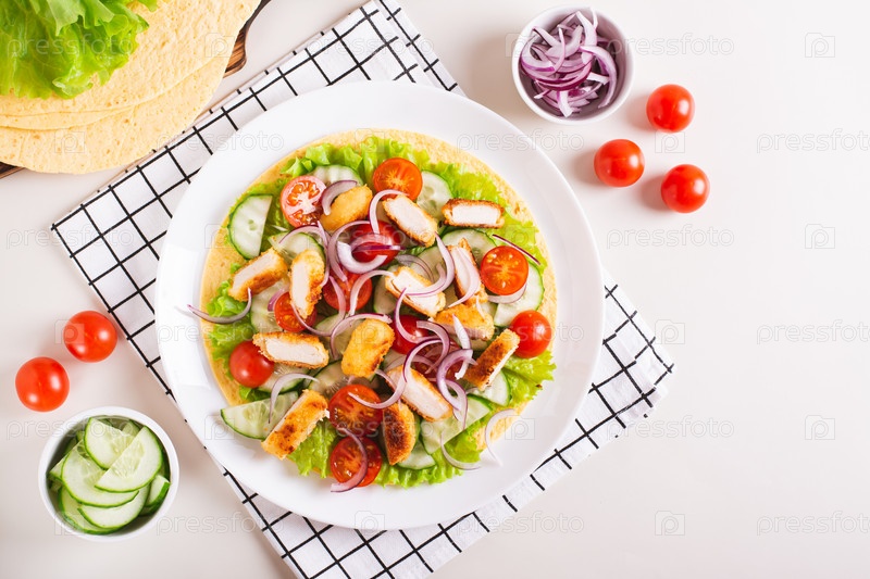 Тортилья с наггетсами, огурцами, помидорами, луком и луком на тарелке на столе
