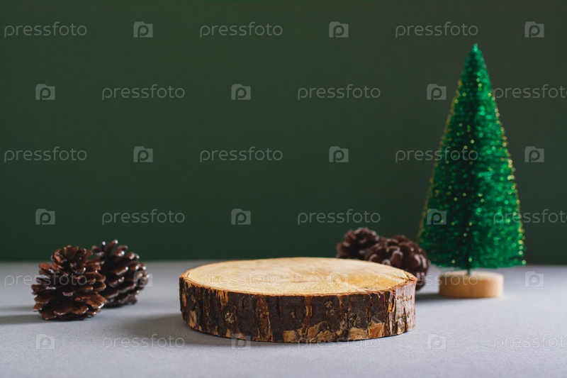 Подиум из срезанного ствола дерева, рождественской елки и сосновых шишек на зеленом фоне