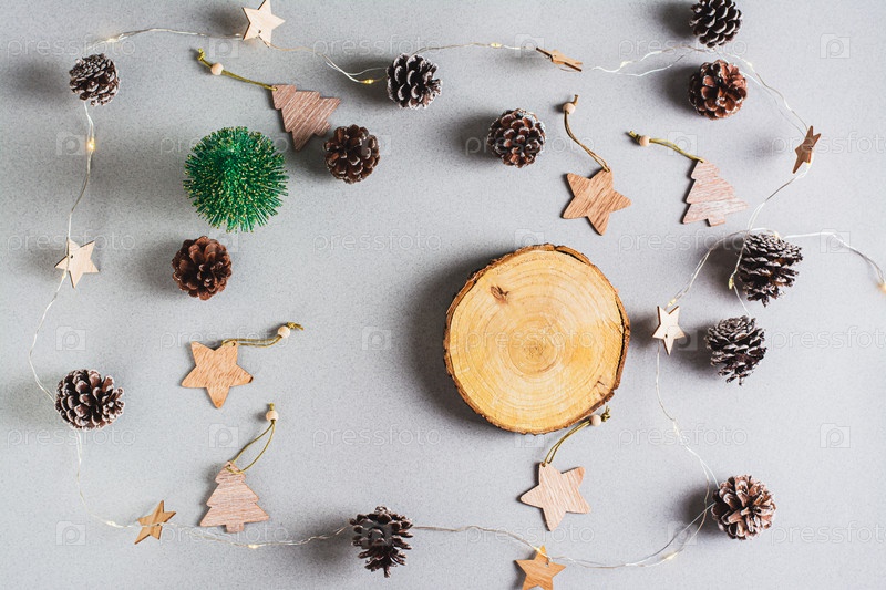 Рождественский фон, гирлянда, сосновые шишки, украшения и срез ствола дерева на сером