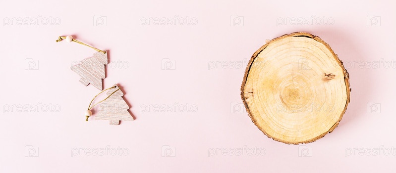 Вырезанный ствол дерева и деревянная ель на розовом фоне, вид сверху веб-баннер