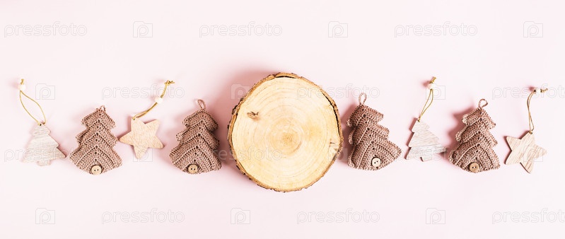 Ствол дерева вырезанный, вязаная и деревянная ель на розовом фоне, вид сверху веб-баннер