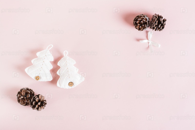 Вязаная елка ручной работы и сосновые шишки на розовом фоне, вид сверху