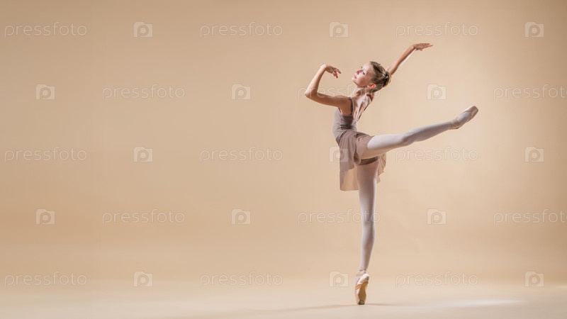 Красивая молодая девушка профессиональная студентка-балерина в пуантах и купальнике на светло-бежевом фоне