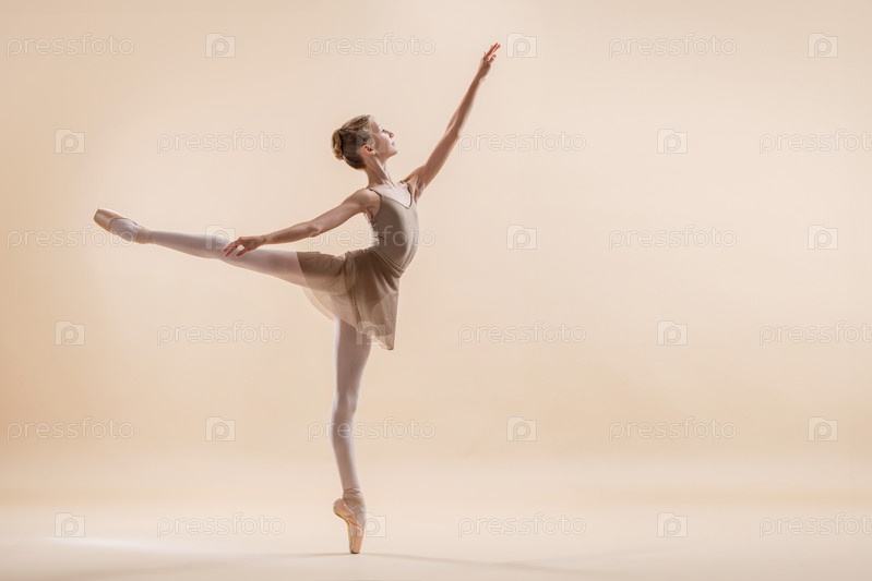 Красивая молодая девушка профессиональная студентка-балерина в пуантах и купальнике на светло-бежевом фоне