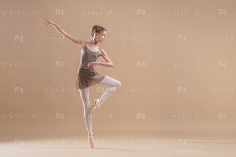 Красивая молодая девушка профессиональная студентка-балерина в пуантах и купальнике на светло-бежевом фоне