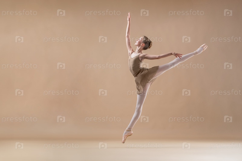 Красивая молодая девушка профессиональная студентка-балерина в пуантах и купальнике на светло-бежевом фоне