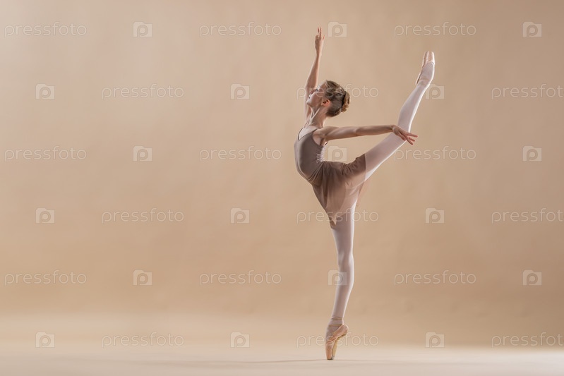 Красивая молодая девушка профессиональная студентка-балерина в пуантах и купальнике на светло-бежевом фоне