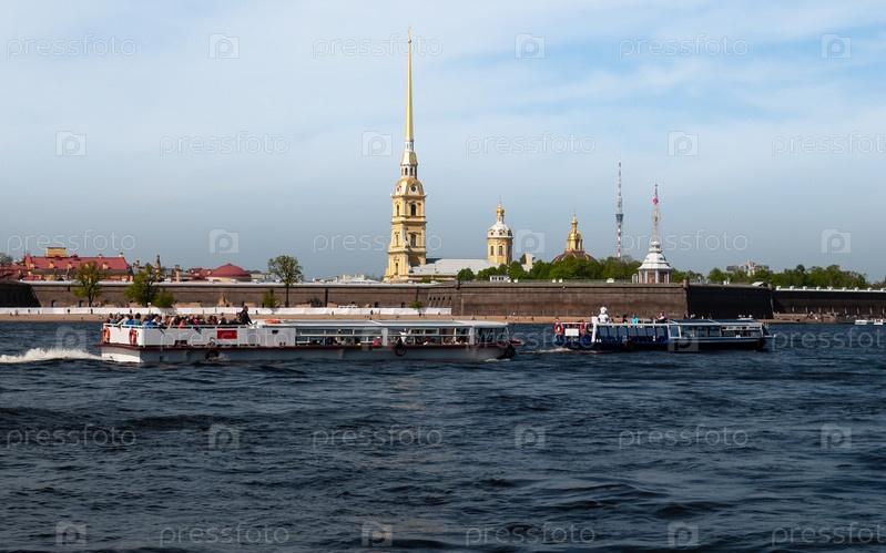 Прогулочные и экскурсионные катера курсируют по Неве мимо Петропавловской крепости, построенной в 1703 году. Санкт-Петербург, Россия
