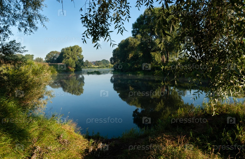Река Нерль, раннее утро, туман. Зеленые кудрявые шапки, ивы наклоняются и отражаются в воде. Владимирская область, Россия