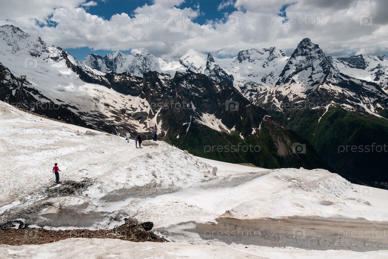 Домбай 2750 м, заснеженные скалы закрывают горизонт, розовый пыльный снег, горное солнце, туристы фотографируются. Кавказ, Россия