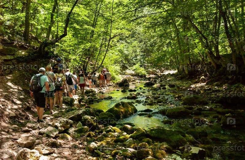 Туристы следуют друг за другом по тенистому скалистому берегу реки на дне Большого Крымского каньона. Зеленый навес. Крым
