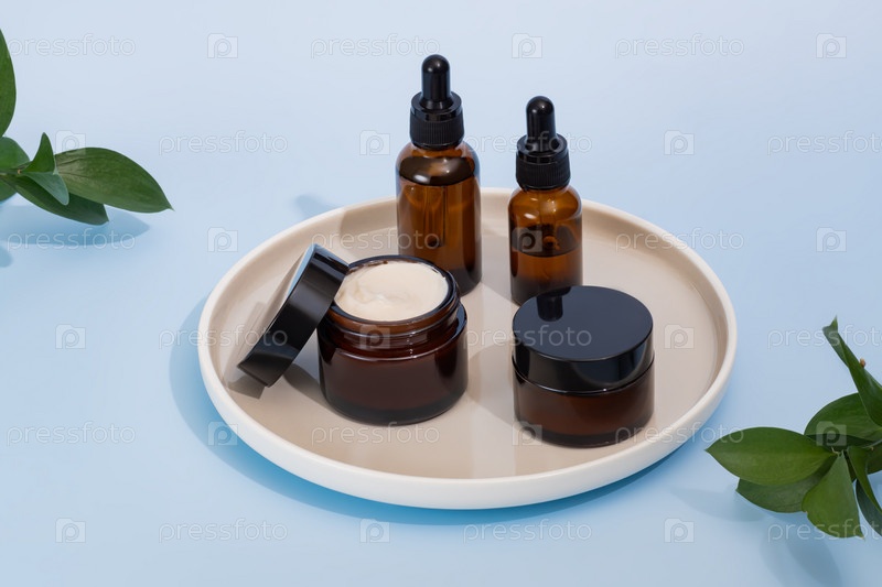 Косметические средства по уходу за кожей на керамическом подносе на синем фоне, набор баночек, капельниц и бутылочек. Спа, ежедневная концепция естественного ухода за кожей