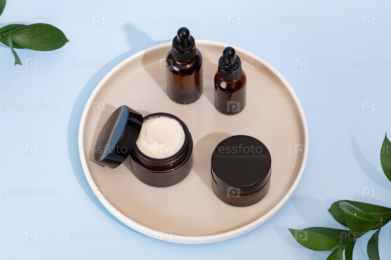 Антивозрастная коллагеновая сыворотка для лица в бутылке из темного стекла и крем для лица на керамическом подносе на синем фоне с зеленой веткой. Концепция натуральной органической косметической красоты