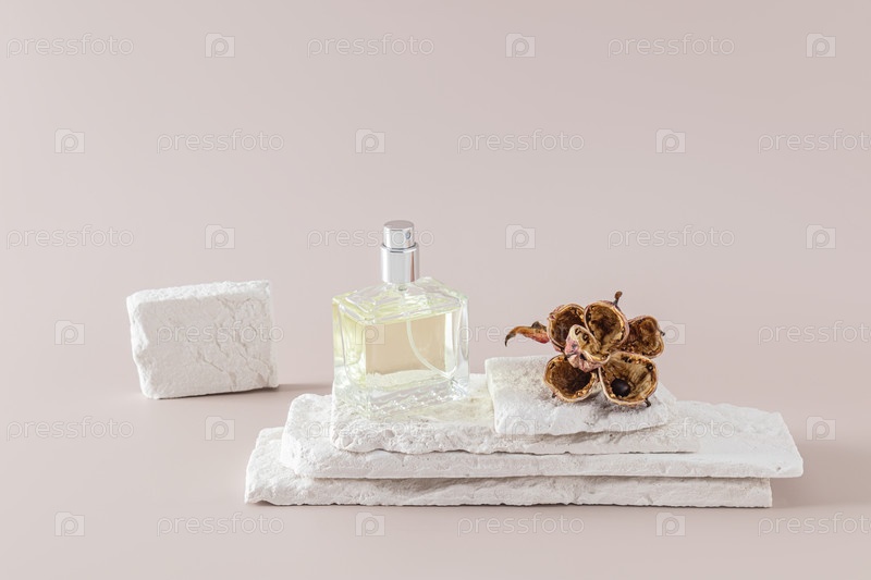 Шикарный флакон духов или туалетной воды на подиуме из кусочков белого кирпича с сухоцветом. Копия помещения. Пастельный фон