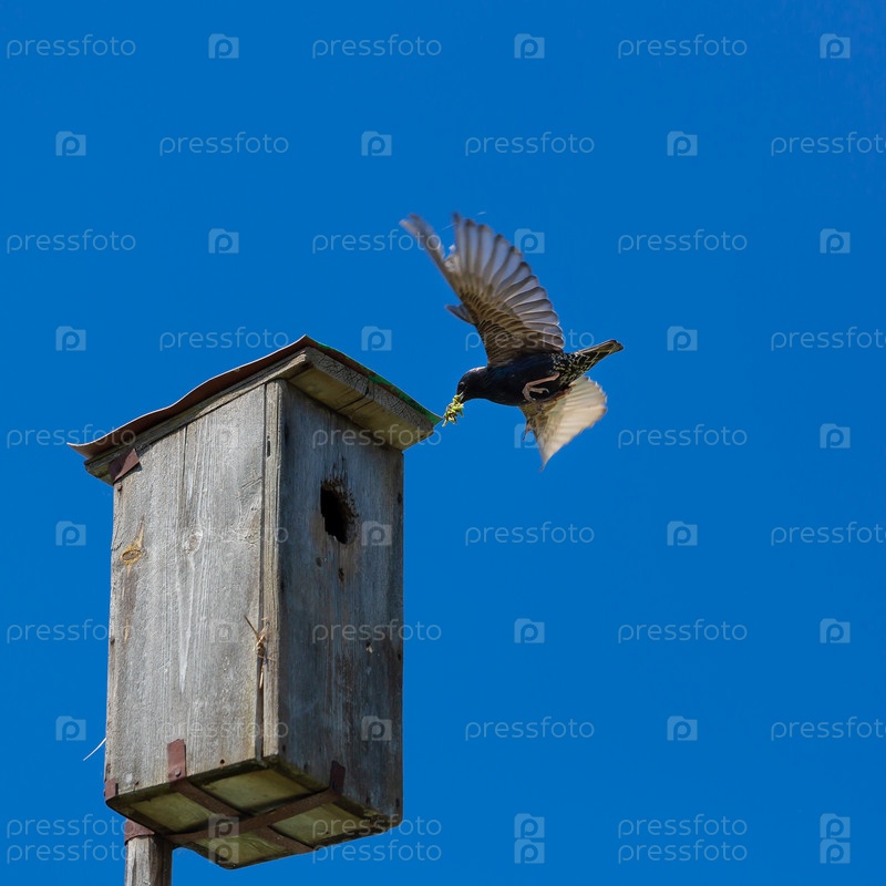 Скворец с добычей в клюве перед скворечником