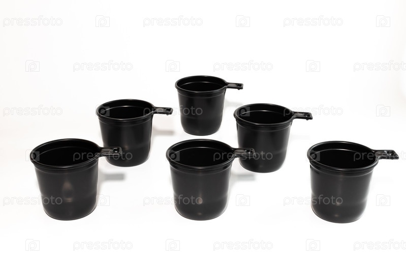 Шесть черных пластиковых чашек на белом фоне в шахматном порядке