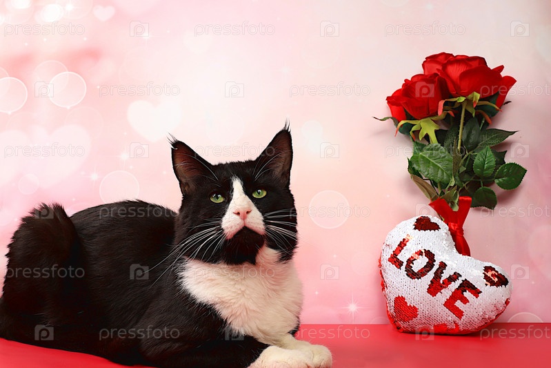 Празднование Дня святого Валентина или Женского дня, Дня матери, баннера. Кот Мейн-Кун поздравляет вас с праздником на фоне букета роз, концепция праздника, дня рождения, свадьбы, выборочный фокус