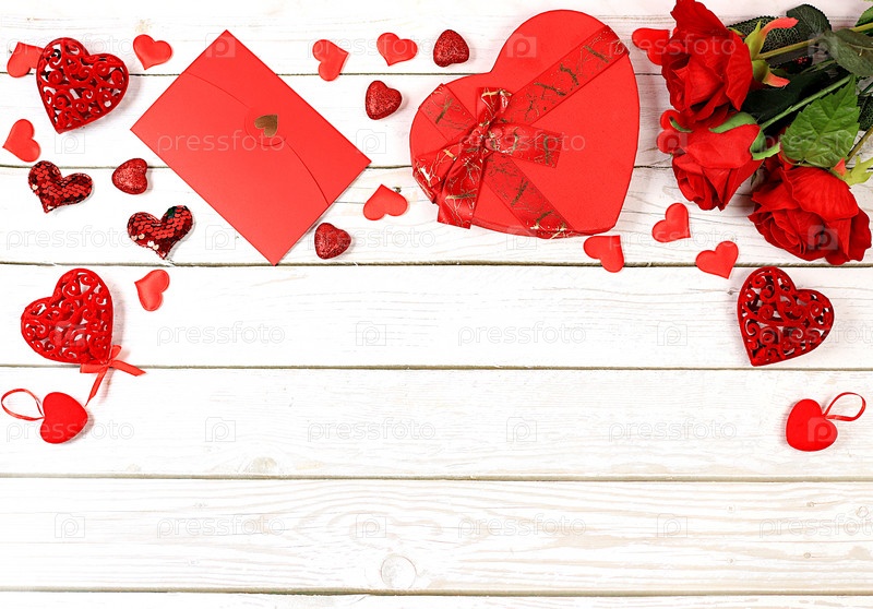 Концепция ко Дню святого Валентина или Женскому дню, Дню матери, баннеру. Поздравительная открытка, розы, сердца и подарочные коробки на деревянном фоне, с праздником, поздравления с днем рождения, выборочный фокус