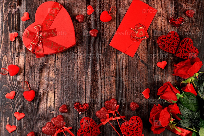 Концепция ко Дню святого Валентина или Женскому дню, Дню матери, баннеру. Поздравительная открытка, розы, сердца и подарочные коробки на деревянном фоне, с праздником, поздравления с днем рождения, выборочный фокус