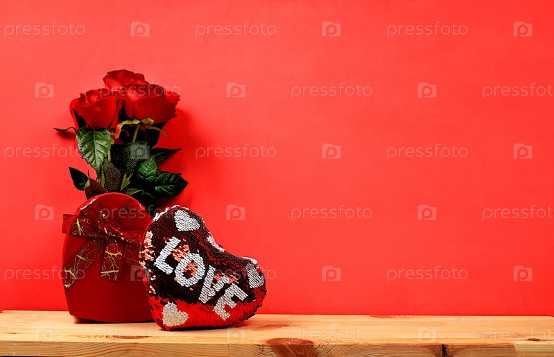 Концепция ко Дню святого Валентина или Женскому дню, Дню матери, баннеру. Поздравительная открытка, розы, сердца и подарочные коробки на красном фоне, с праздником, поздравления с днем рождения, с