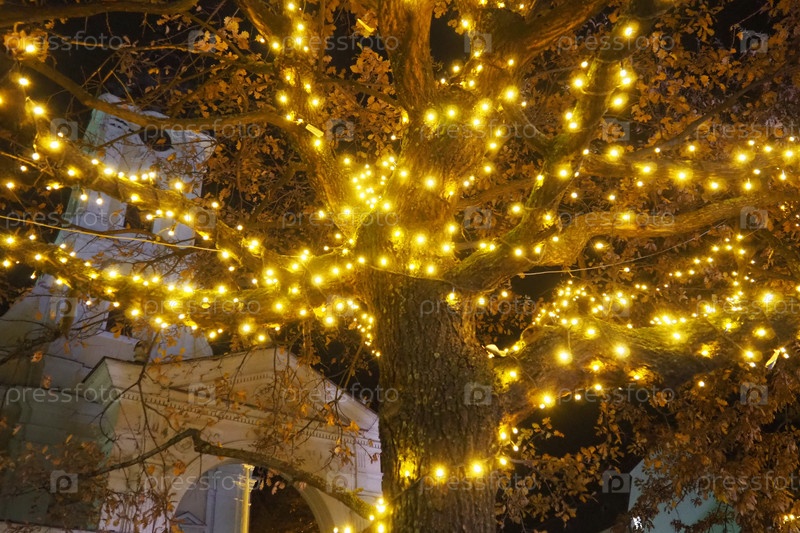 На дубе висят золотисто-желтые гирлянды. Ствол и крона покрыты сухими дубовыми листьями. Листья колышутся на ветру. Рождественское и новогоднее украшение улиц города иллюминацией. Декор ночного города