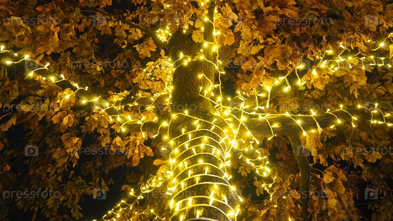На дубе висят золотисто-желтые гирлянды. Ствол и крона покрыты сухими дубовыми листьями. Листья колышутся на ветру. Рождественское и новогоднее украшение улиц города иллюминацией. Декор ночного города