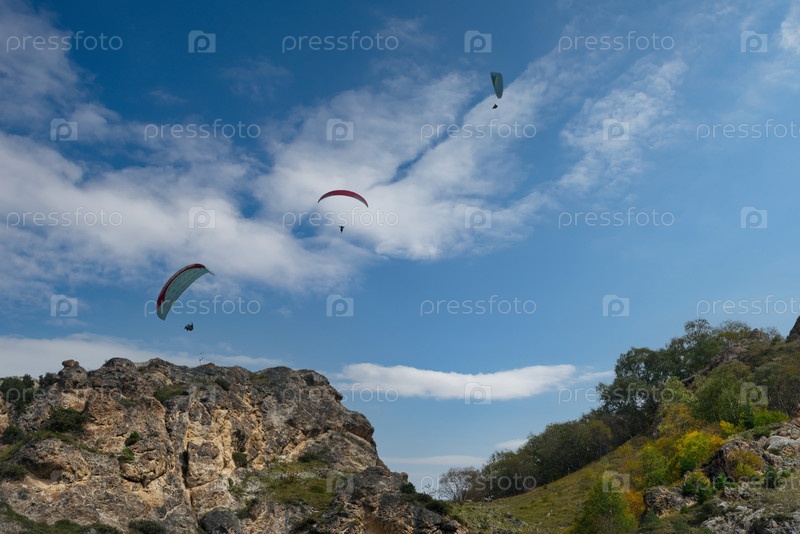 Россия. Северный Кавказ, Кабардино-Балкария. Полет парапланеристов над живописными скалами Чегемского ущелья