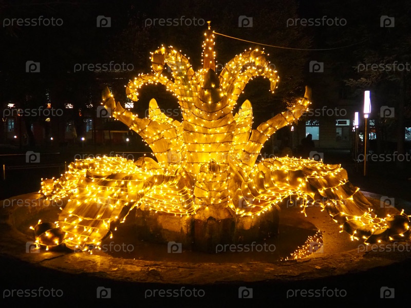 Сремска-Митровица, Сербия 13.12.23 Городской парк и фонтан «Каменный цветок». На городском фонтане развешаны новогодние рождественские гирлянды. Желтые лампочки светят. Праздничное настроение
