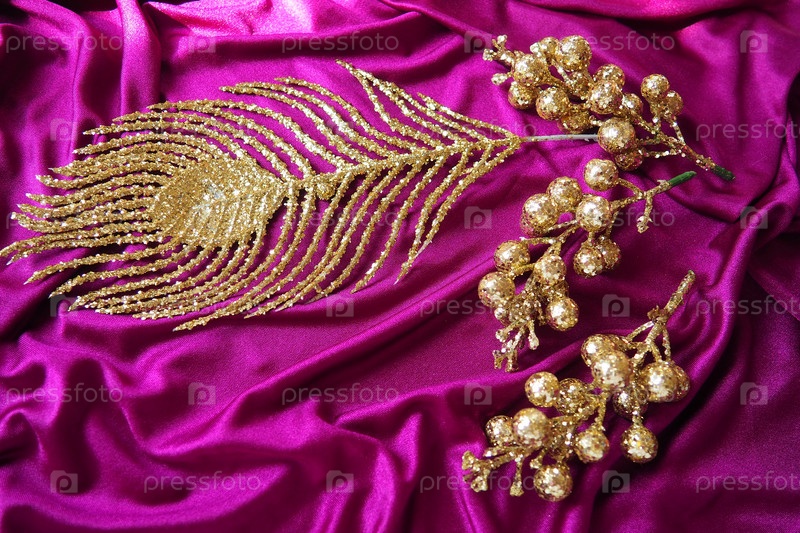 Фиолетовый розовый сиреневый фиолетовый фон текстуры шелковой ткани. Красивые складки на скрученном материале. Золотые новогодние рождественские украшения, перо Жар-птицы, ягоды и веточки. Копирование пространства. Рождественский дизайн